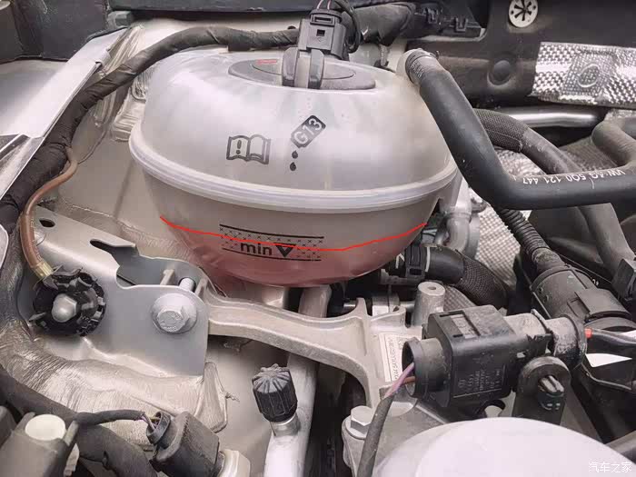 这个透明的壶就是冷却液壶,可以看到里面的冷却液处于什么液位,只要冷却液处在上下两道刻度线之间就属于正常范围,我的正好在两道刻度的中间,液位正常。