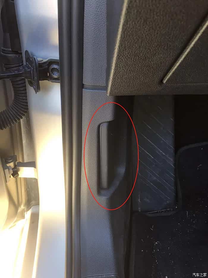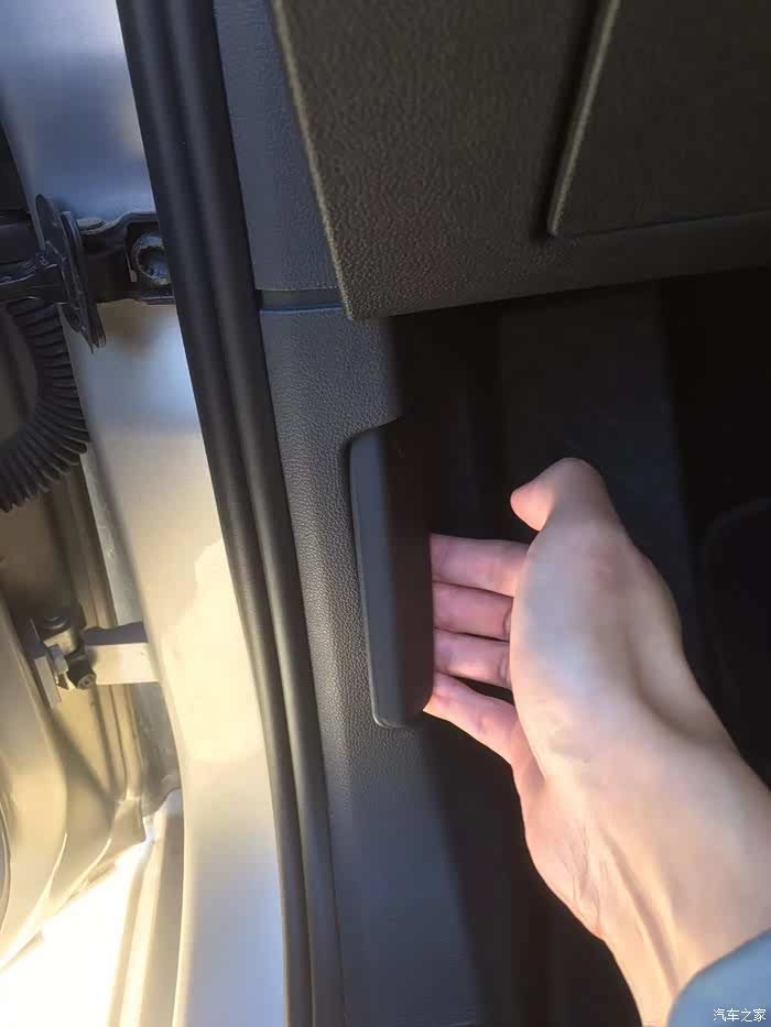 添加玻璃水需要打开机舱,机舱的开关隐藏在驾驶室车门旁。打开驾驶室的车门,这时会在门框的下方的下方找到开关。