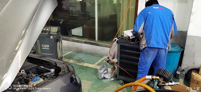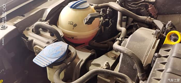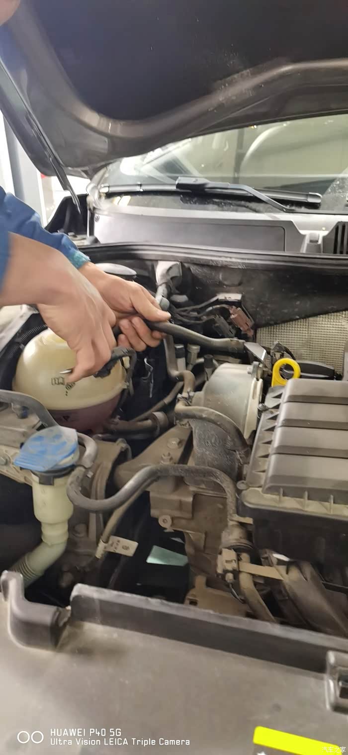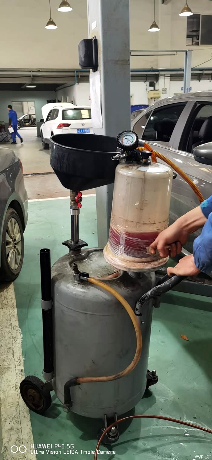 加完保护剂之后,师傅就把管子都拔掉,准备收工了,储液罐上面的半透明白桶里装的就是我车子的冷却液