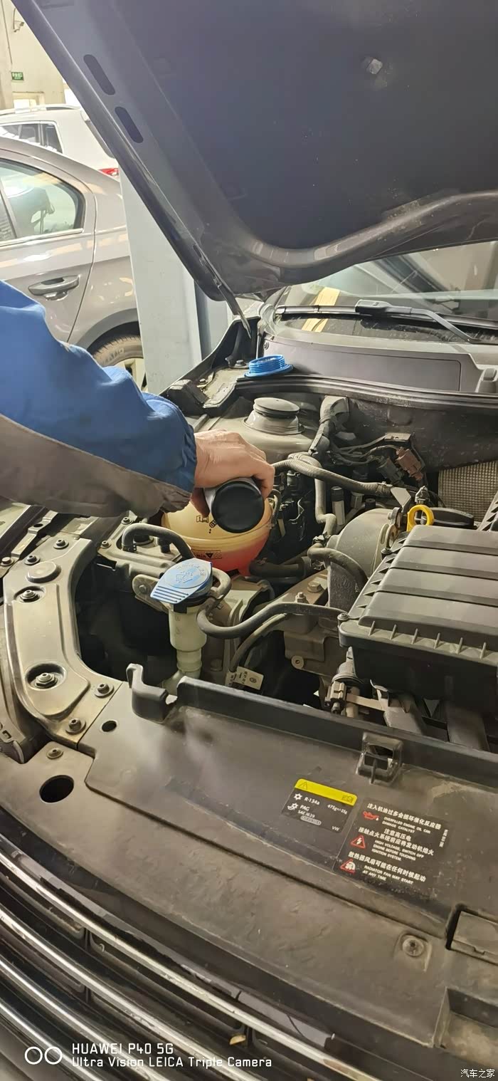 然后维修师傅开始给冷却液壶里倒入新的冷却液,倒了两瓶4升,液位超过上限了,但我知道当发动机第一次启动后,液位就会恢复正常