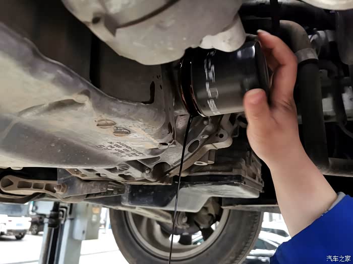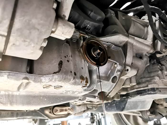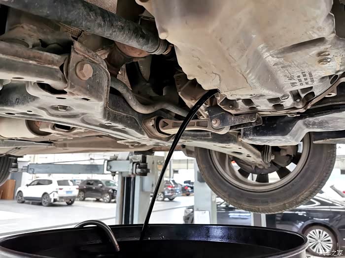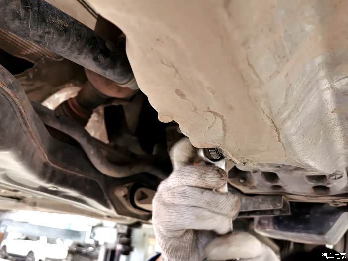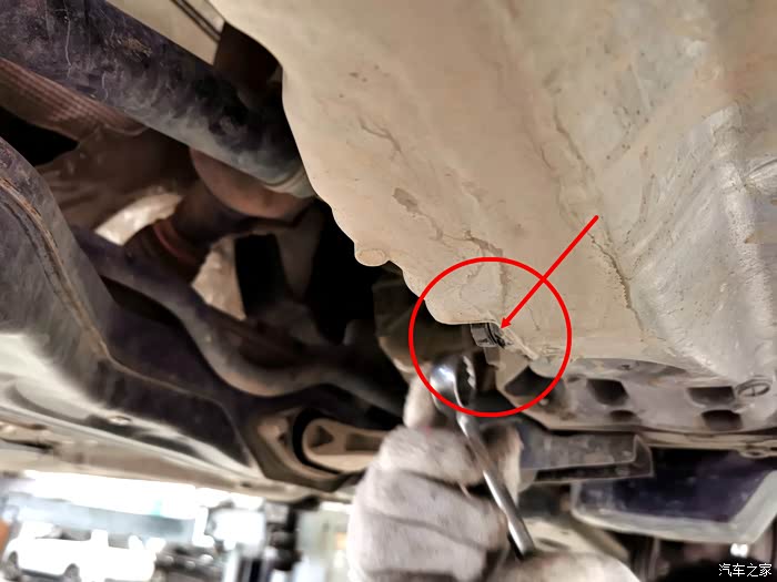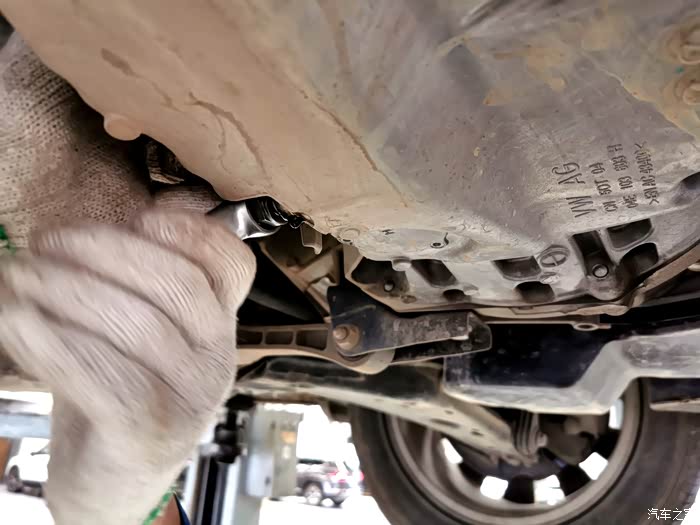 接下来拆油封螺丝,改款后的朗逸放机油孔在底部位置,所以要先车子升起来,从下面拧开油封螺丝放油。