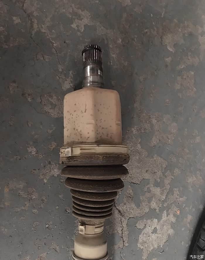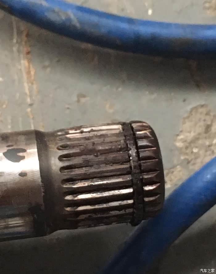 传动轴已经取出,我们可以看到外观基本良好,密封套也是完好无损的,这里面是润滑油不能破裂否则万向节失去润滑,造成严重问题。