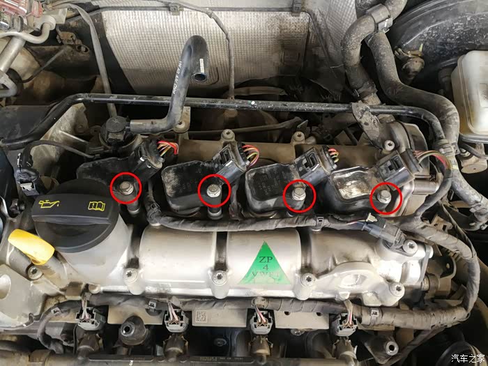 清理干净后,准备工始拆卸点火线圈。4个点火线圈由4个螺丝固定,卸掉固定螺丝就可以拆掉点火线圈了。