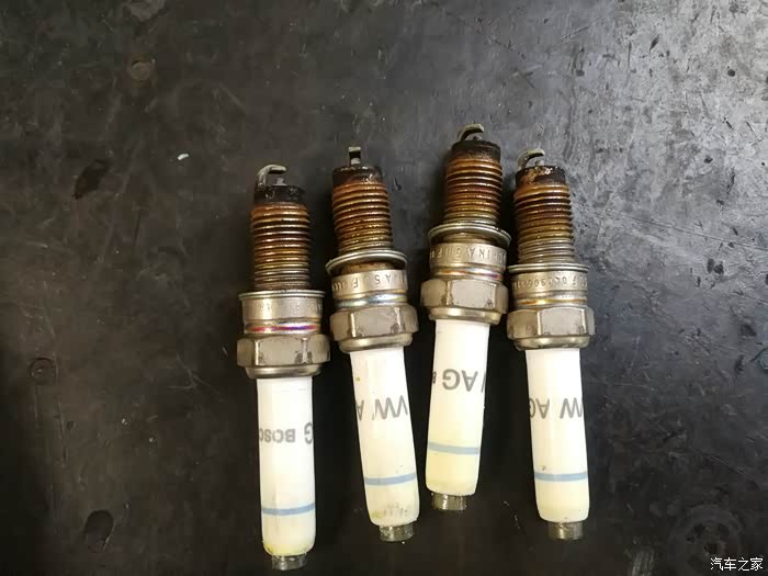 这是用了40000公里的火花塞,点火部位有了不少的积碳。原厂火花塞是用博世代工生产的,依晰可见火花塞表面的“博世”英文标志。