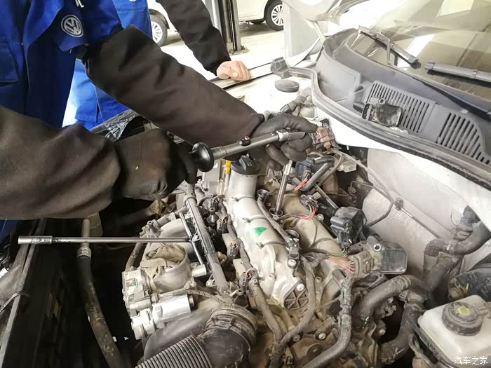 维修师傅拿出拆卸火花塞的专用套筒和棘轮扳手,开始拆卸火花塞。