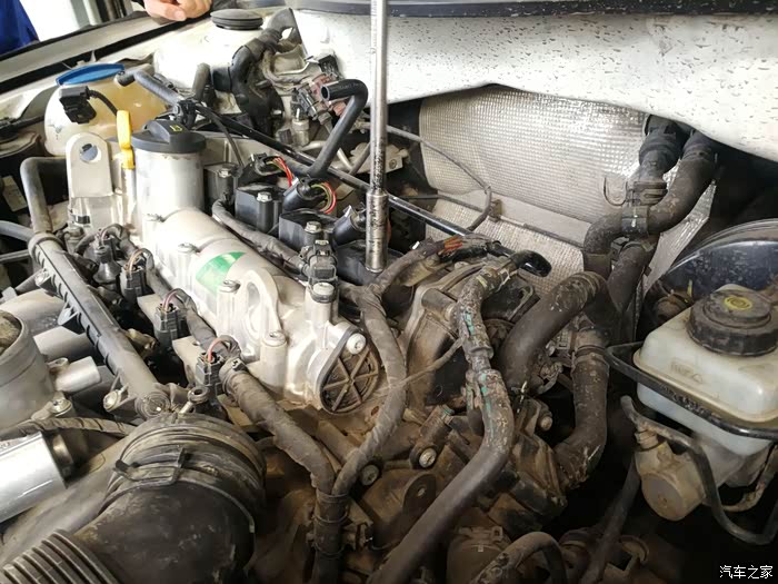发动机上灰尘太多,维修师傅吹掉上面的灰尘。在清理灰尘时,一定要堵住节气门,防止灰尘进入。
