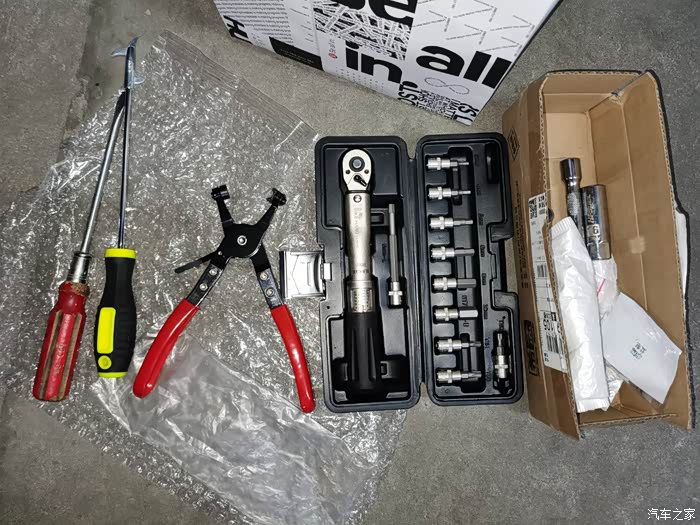 开始动手前,工具先准备好。卡箍钳(拆进气管)、扭力扳手、16#磁性火花塞套筒、高压包螺栓套筒、加长杆、高压硅脂。