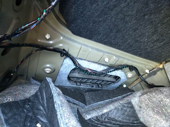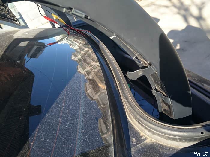 线路接上整流器后从后备箱盖穿至后盖支臂。整流器就粘在后盖里面固定好。