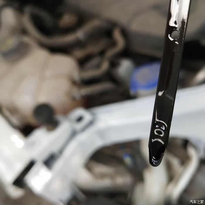 插播一下检查机油的小知识点及注意事项:机油尺上两个小点分别代表上止点和下止点,再次拔出机油后应该注意机油尺应该一直垂直不要让机油尺上的机油倒流导致机油测量不准。机油够与够的标准在于上止点下大约两颗米的距离为最好的距离。那个的时候的发动机动力最好。如发现机油的位置下两点的中间偏下的话就可以考虑更换机油。或者用干净的纸巾擦拭过后看有的颜色如果有明显的偏黑就一定要及时的更换机油了。