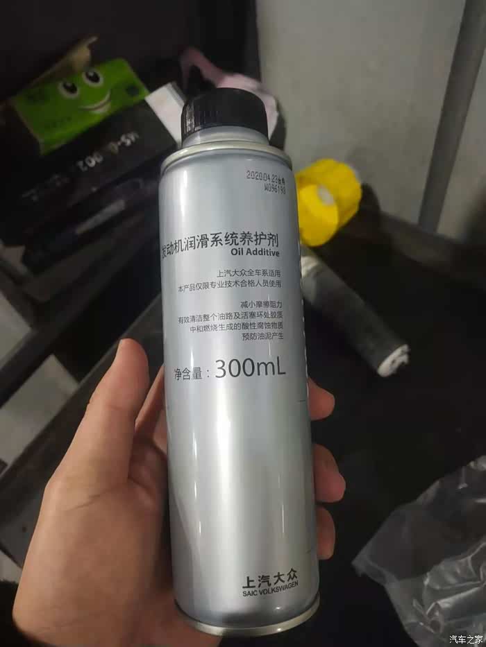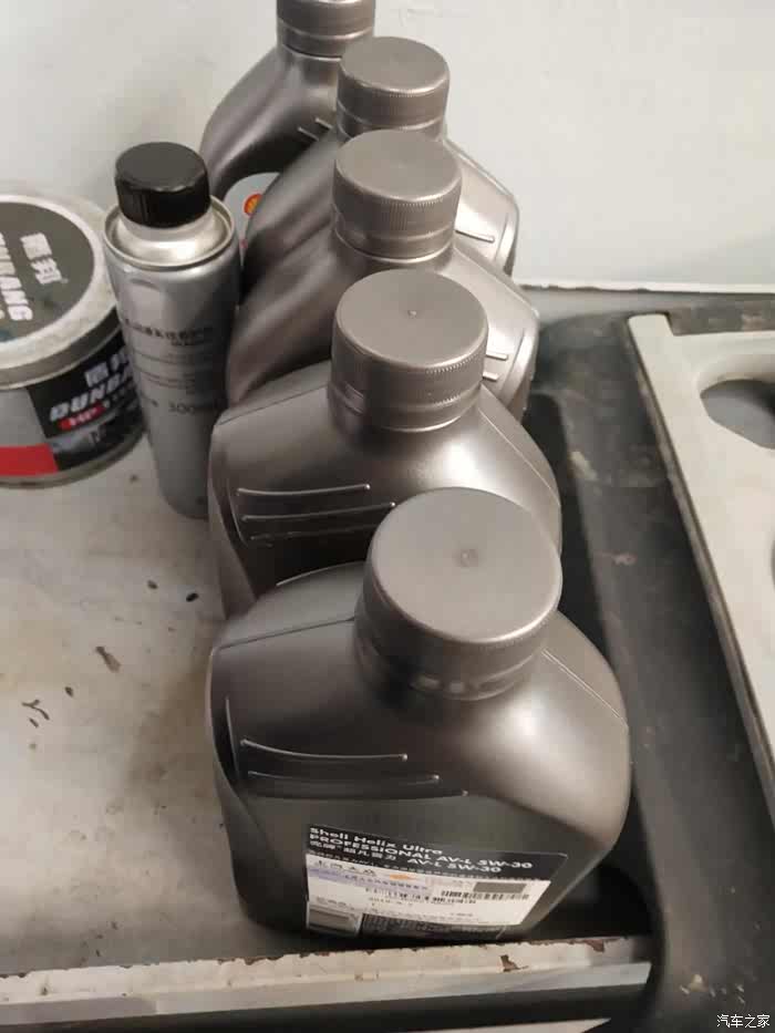 先加入发动机润滑系统养护剂,然后再加入机油,由于养护剂有300毫升,之前剩的机油有多半桶,开出的四桶机油,竟余了一桶