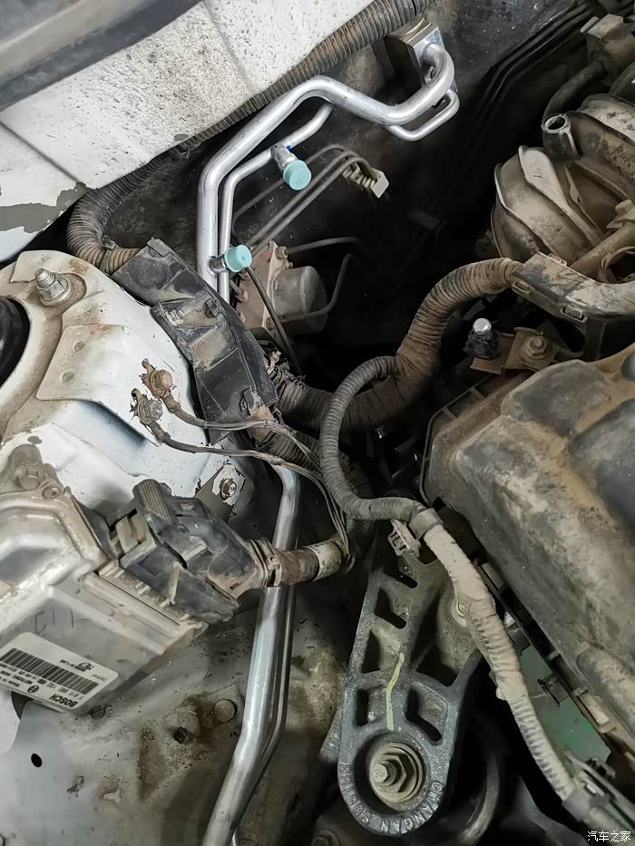 空调高低压管也换了新的,漏冷凝剂了,撞车后修理厂换的空调管没有固定卡扣,只是用扎带绑了一下,导致在工地跑了没多久就颠坏了