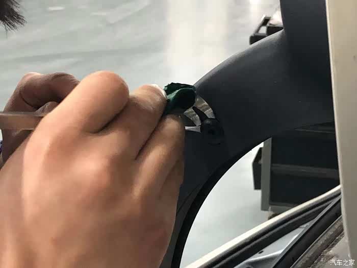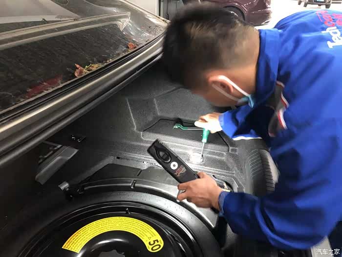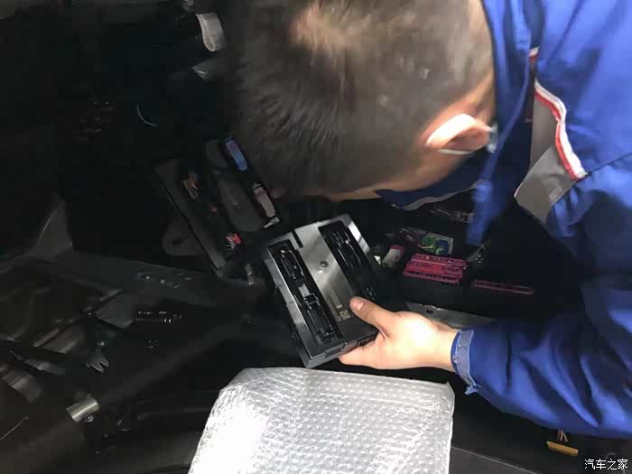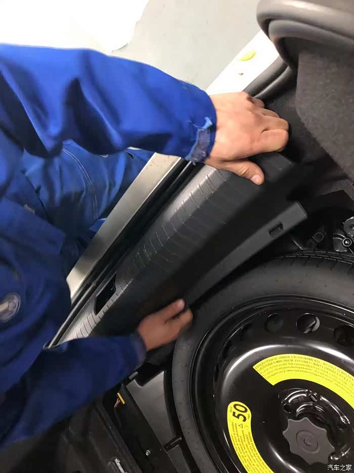 进了4s店里先把车子停上工位,然后技师拿来了要更换的模块。原来这个模块是放在后备箱里的,要换模块就得先拆后备箱的底板