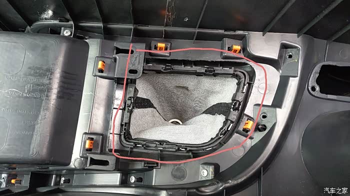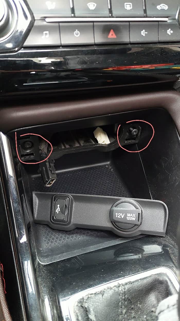 4、先用撬棍把点烟器面板撬开,把插头拔掉,再用六角螺丝刀把图上红圈两颗螺丝拧开。