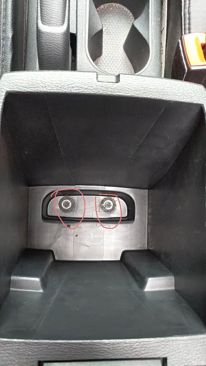 5、把扶手箱里面的止震板拿开就可以看见两颗螺丝,用套筒拧开。