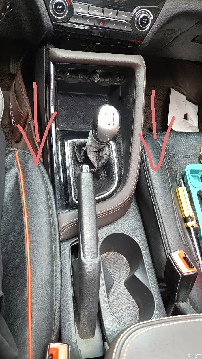 6、把手刹用力拉起来(要拉高一点),把小面板用撬棍撬开。