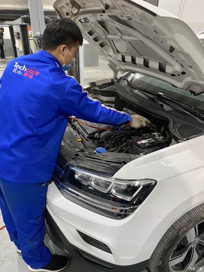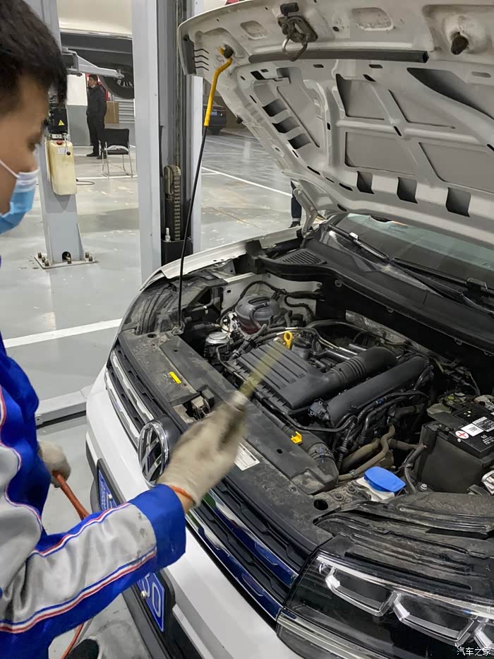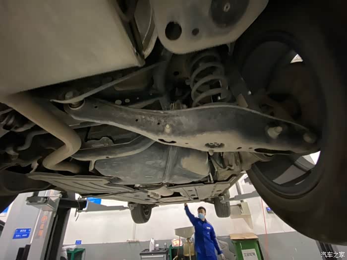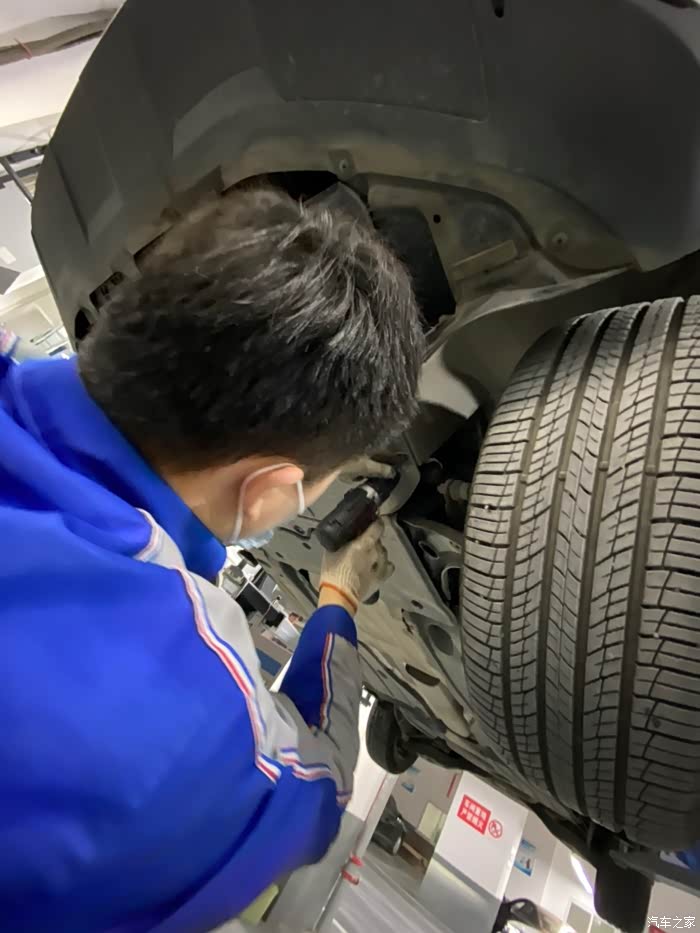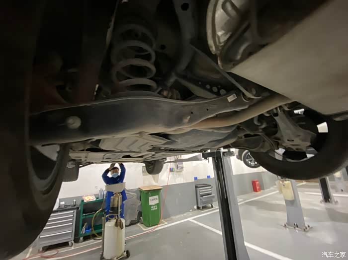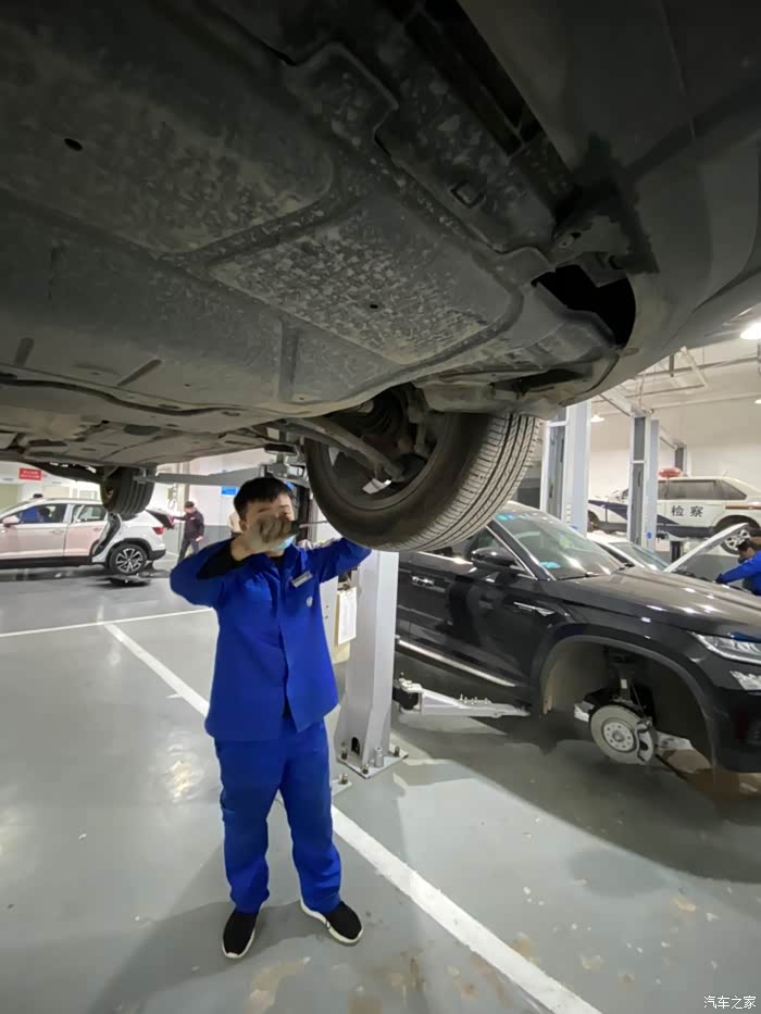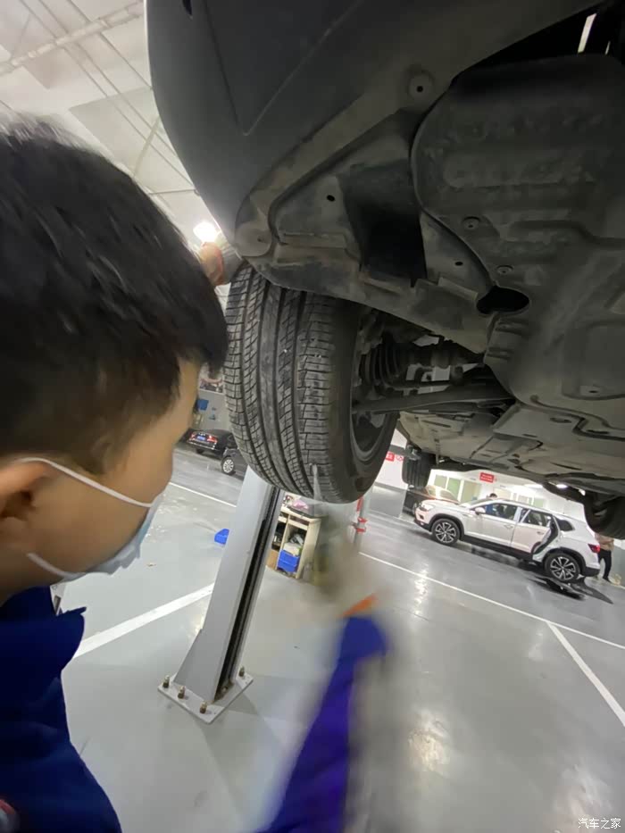 车开到车间后,师傅熟练地把车开到铁架子里面,升起来,拆护板,卸螺丝,一顿熟练地操作,我就在旁边看着,偶尔问问关于蹭底盘啊,上马路牙子啊,刹车等问题,师傅也是认真帮我解释,像什么前后轮到一定时间后得倒腾一下,防冻液到刻度值后得加一下,玻璃水入冬了得加零下的,总之学了好多,关键是这一顿操作完全免费,哈哈,真是人品大爆发了。