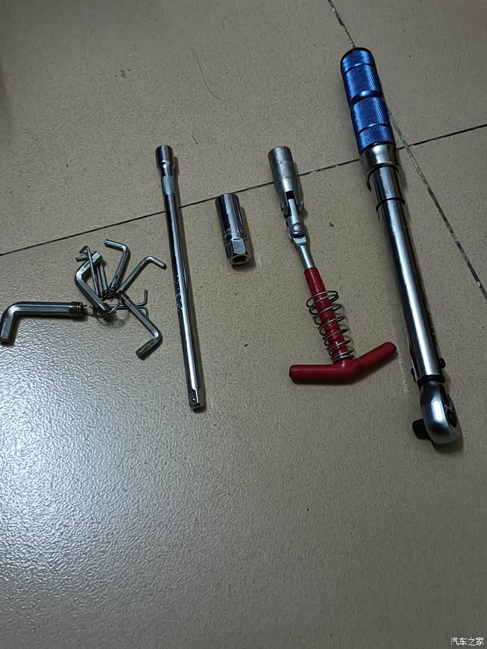 工具也简单,扭矩扳手,16MM的火花塞套筒,棘轮扳手跟套筒的连接杆,六角扳手。其实那个红色普通套筒可有可无,只是我比较习惯用罢了,到毕竟难拧的地方或者最后确定力矩的时候才用力矩扳手。