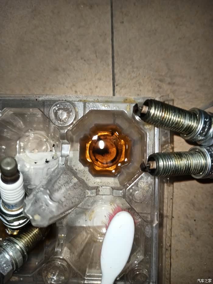 本来无色的清洗剂一放火花塞下去,马上就变黄了。