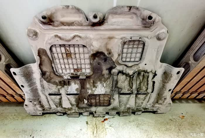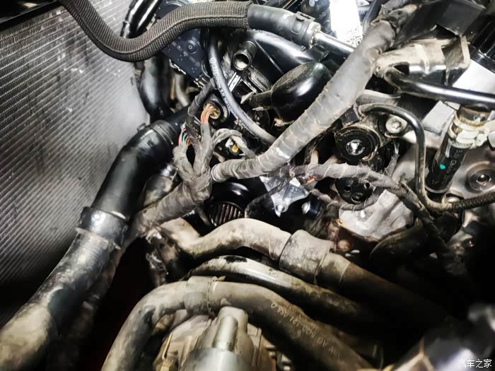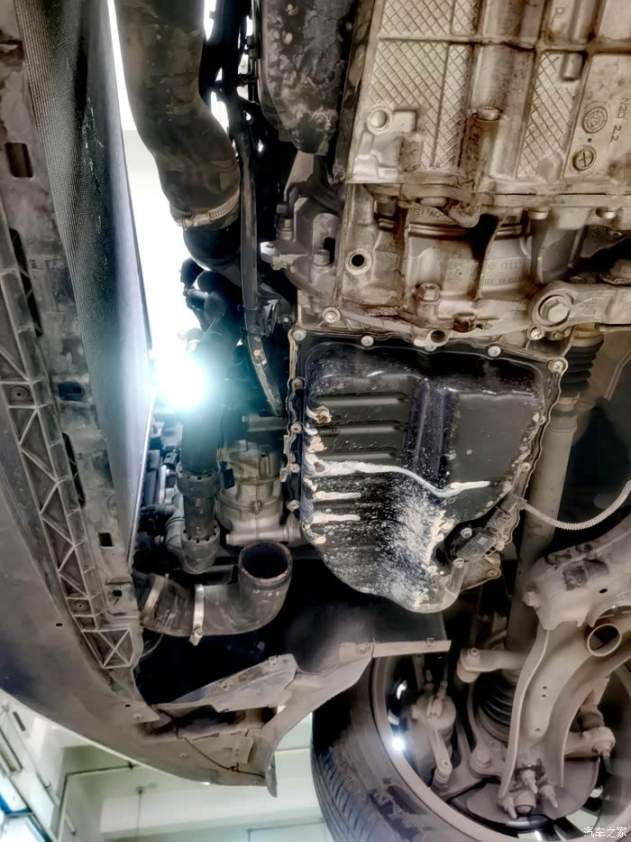 抬起发动机拆管子,油底壳上都是干了的防冻液结晶,起初还以为是油底壳锈了腐蚀了,吓我一跳