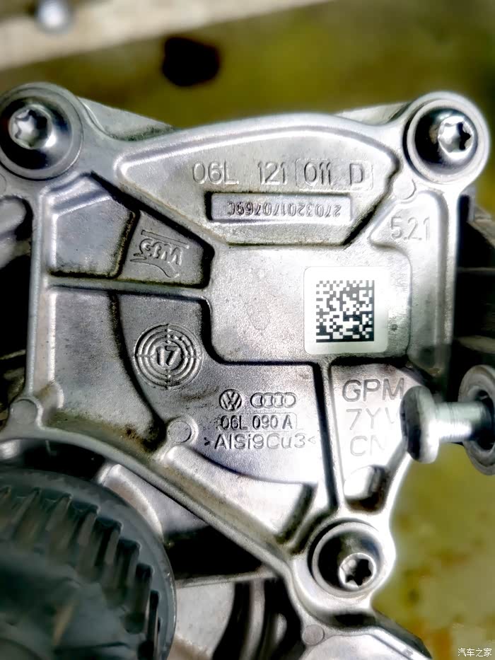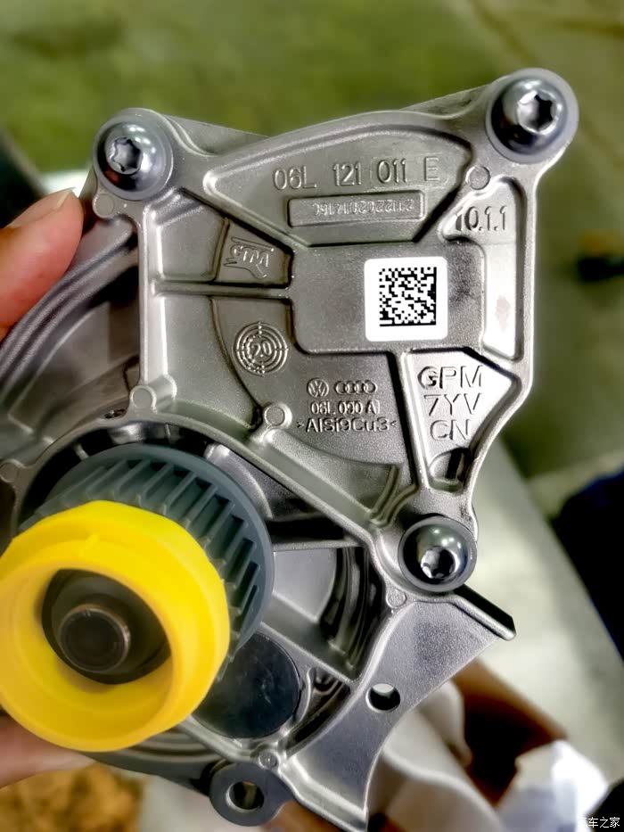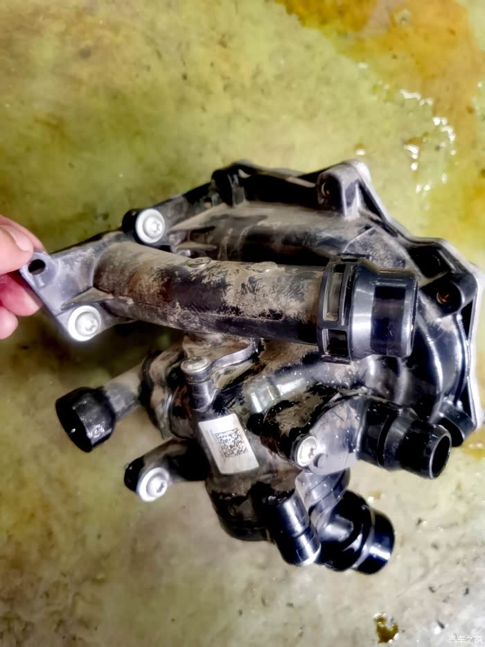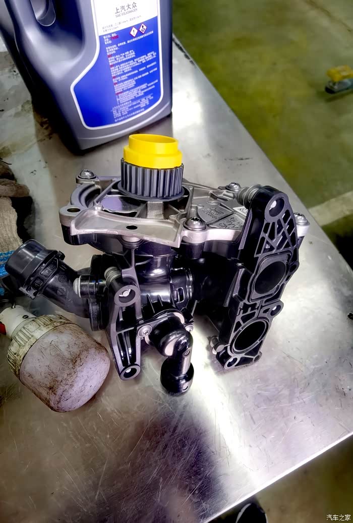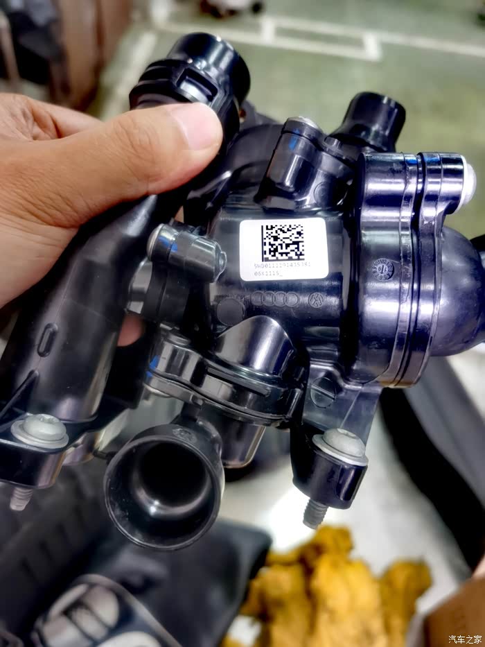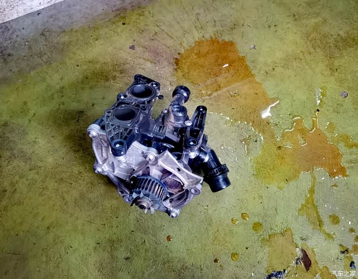 由于索赔了新的节温器,旧的节温器虽然没找到到漏水点但还是换新了,了解到三代EA888发动机1.8T的节温器和2.0的还不一样,1.8T的节温器很少漏,这次漏的是水泵