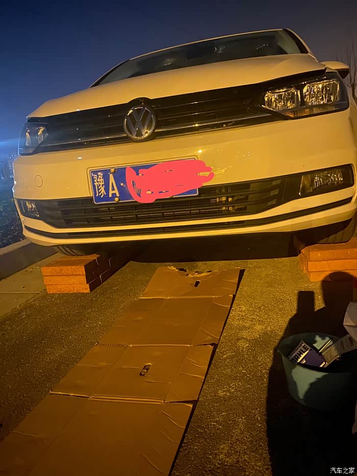 因为限行,9点半才到的家,拿上工具材料立刻出发,既然想省钱,那么我连修理厂都不去,自己找了个断头路,搬砖,把车开砖头上去~后轮在地面,正好形成一个斜坡,有助于把油放干净!