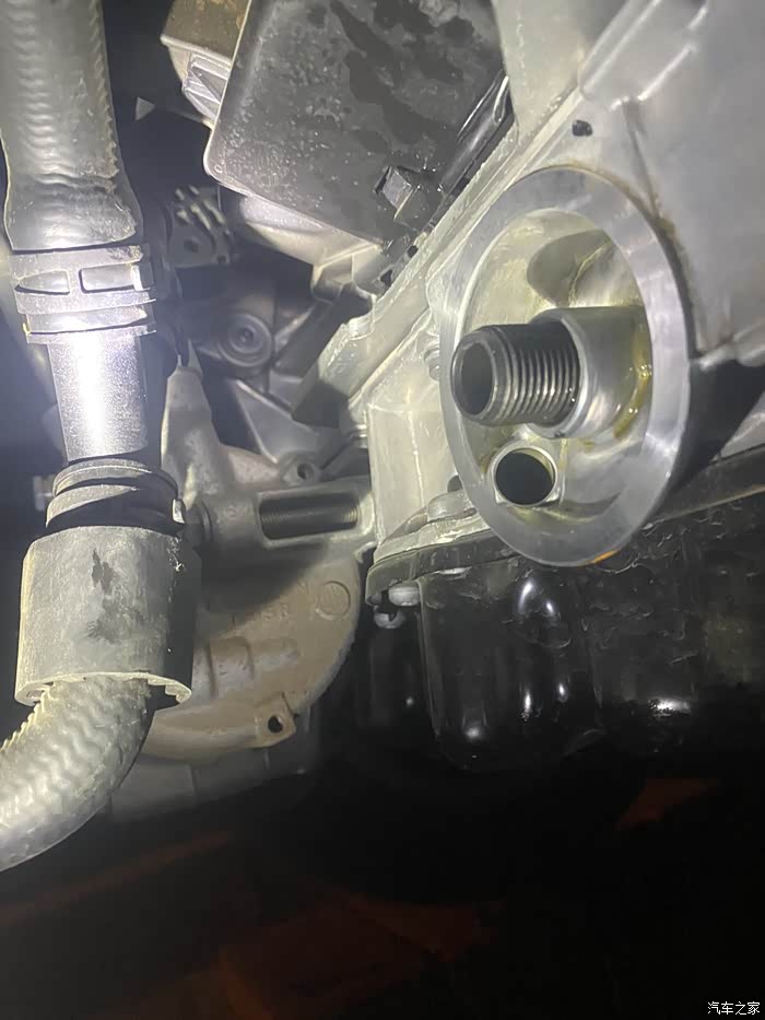 完全拧掉放油螺栓,废油流出~话说废油呈深棕色,特别的脏~