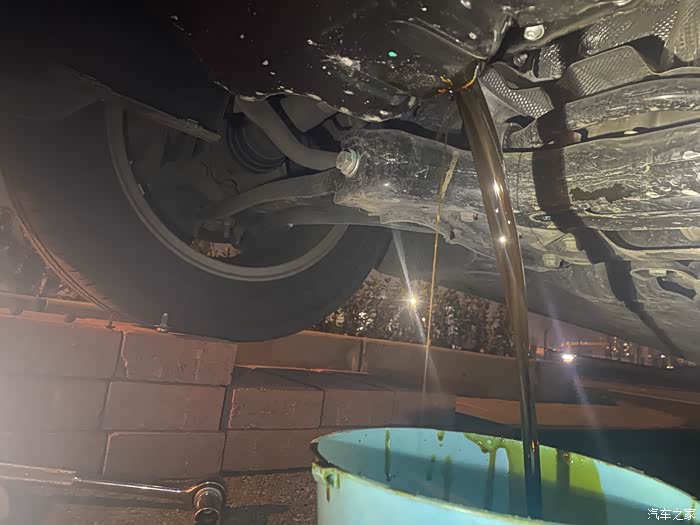拧松排油螺栓~使油流出,用的是19#的套筒扳手~(下方有个小桶接废油)