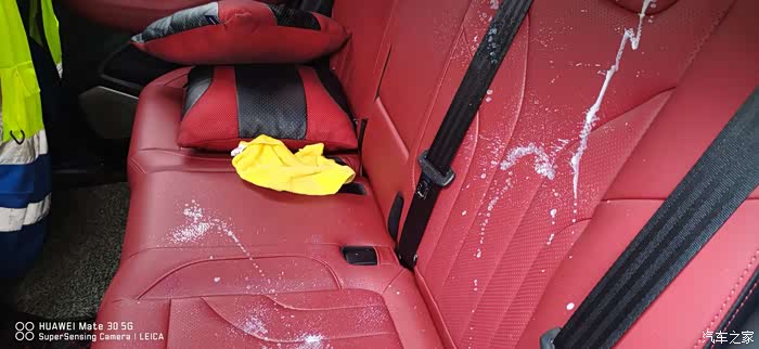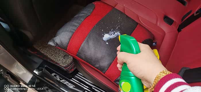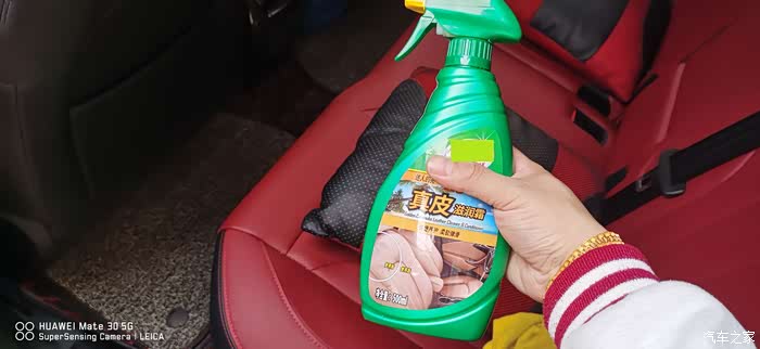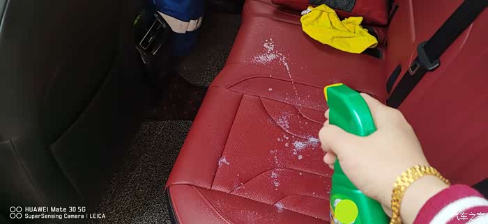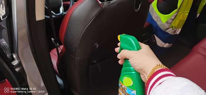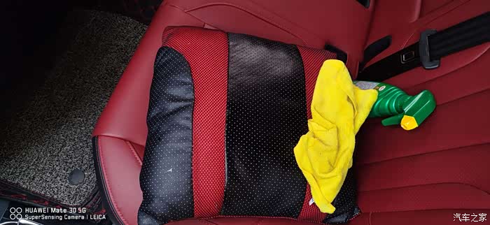 开始的时候大家先找个真皮的坐垫像我的那个,或者是前座椅的后面,擦拭一下,试一下效果,或者脱色什么的。确保万无一失。