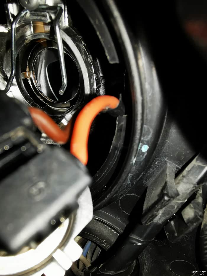 两张图放在一起对比就明白了,右侧的安装深度明显要比左侧深很多,右侧这张图才是正在安装成功的样子,我一开始按左侧照错误的情况实用了一周,一直以为自己已经安装到位了,但是夜晚开灯的时候方向新安装这一侧明显暗很多,而且射不远,聚光也很杂乱。下面会介绍我自己研究的如何判断是否安装到位方法。