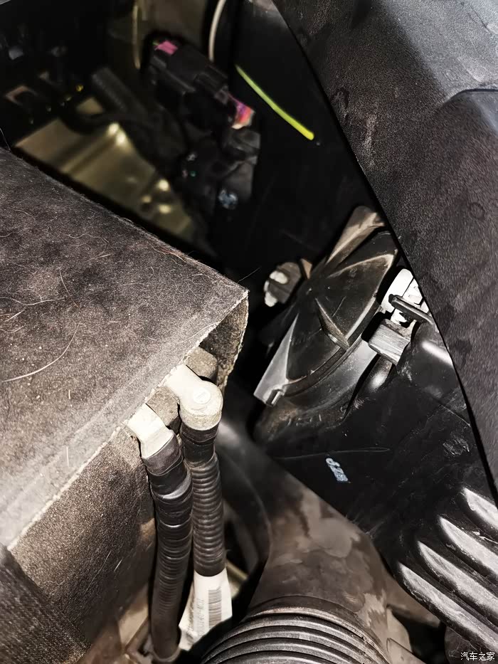 藏在前桥下方,保险盒前方的那个白线位置就是近光灯密封盖了!位置实在是非常狭小