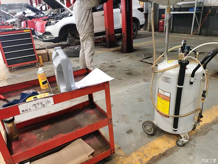 师傅正在更换机油,我就在旁边学习一下