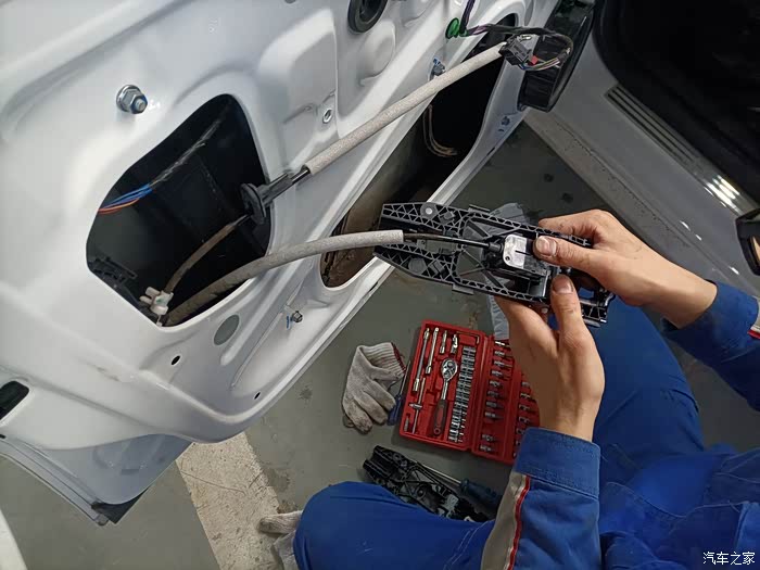 再将密封胶片安装上去,依次将门板,扶手,玻璃升降操作台安装上去,检查玻璃升降按钮和后视镜调节按钮是否可以正常工作。没有问题就直接安装固定好螺丝。最后再将锁芯安装回去。