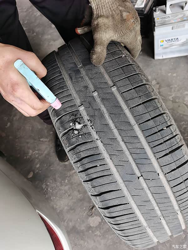 拆下轮胎后这么长的钉子穿进去看着就恐怖,心情就沉了下来,且这两周周日来回家跑高速,真的危险极了,幸好早点来检查、补胎,不然上高速问题就严重了。