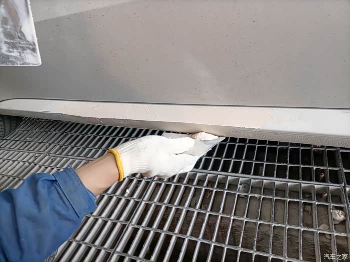 小区停车场不知道什么时候安装了很矮的限位桩,一不留神给把爱车驾驶位下方的侧裙挂压下去了。心疼至极。只是变形,油漆没有损伤,所以联系了无痕修复师傅,师傅说这个地方无痕修复难度较大,很难恢复原样。受伤面积也不小,不去修复太难看了。所以无奈只能做钣金油漆了。经过均衡修复效果很价格最终选择了去4s店修复。都说4s店油漆质量比较好。提前预约好4s店顾问。一大早驱车来到4s店。这几天不是很忙,当天修复完工,第二天可以提车,需要俩天时间。效率还算可以。一路在师傅旁边学习,顺便记录一下修复过程,和各位车友分享一下。