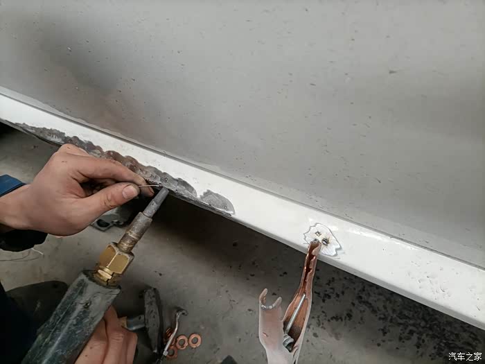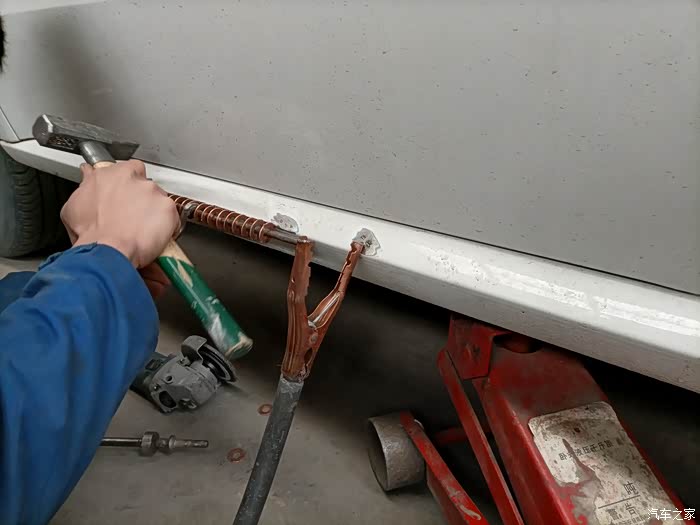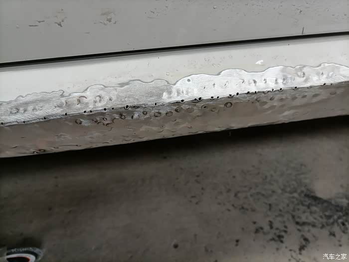 首先要把原车漆用砂轮打磨掉,点焊焊捞小垫片然后牵引受伤面积,让其尽量回复原始形状。大的位置牵引到位后,再用点焊棒小面积继续牵引修复期间就是拉拉敲敲。大概形状修复完成后,再将点焊的小洞焊好填补,然后再进行下一步工序。期间看着很是心疼啊。扯裙点焊部位已经点漏,一排排小洞。不知道后期会不会从里面生锈。