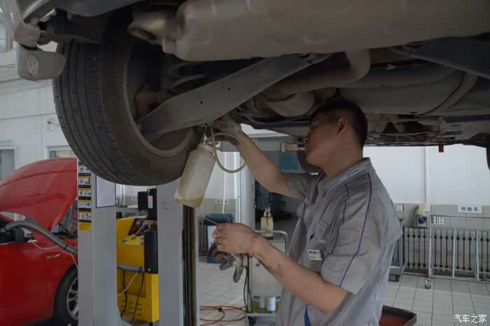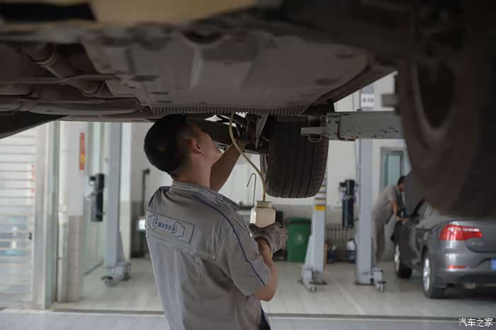 技师在每个轮胎进行旧油液收集