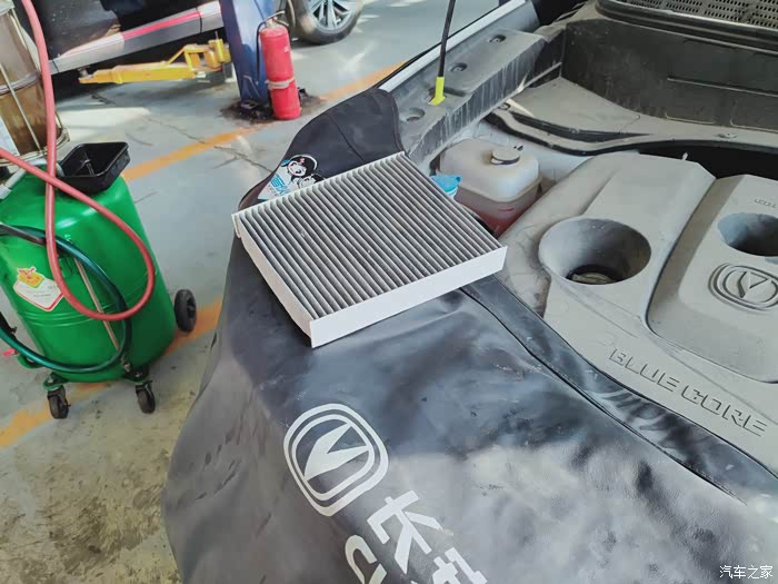 趁着抽机油的间隙时间,把空调滤芯拿出来吹一下,看得出长安服务的工作效率还是可以的