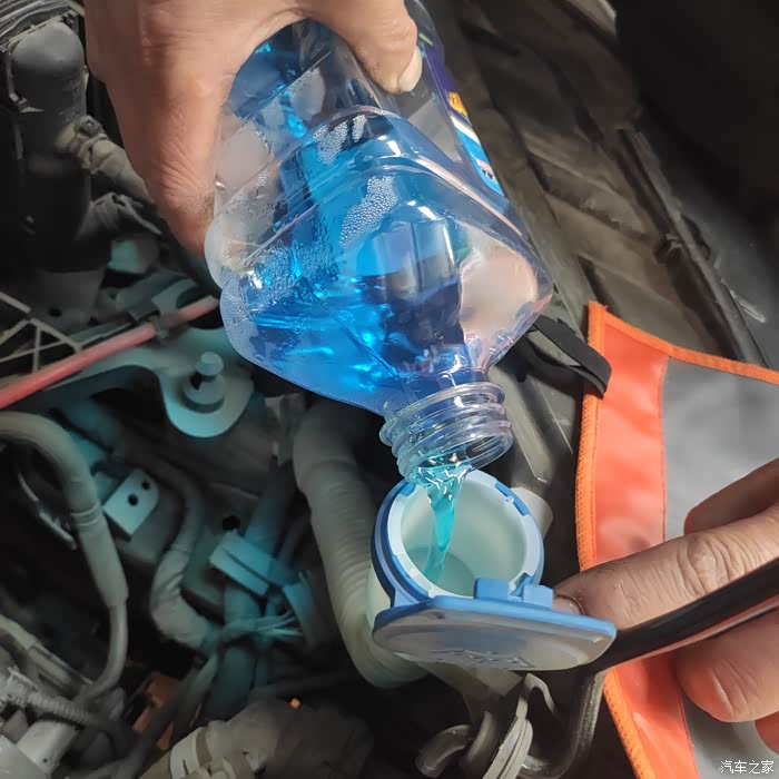 接下来就是玻璃水一瓶加进去还没有满,再加一点自来水满了就好。