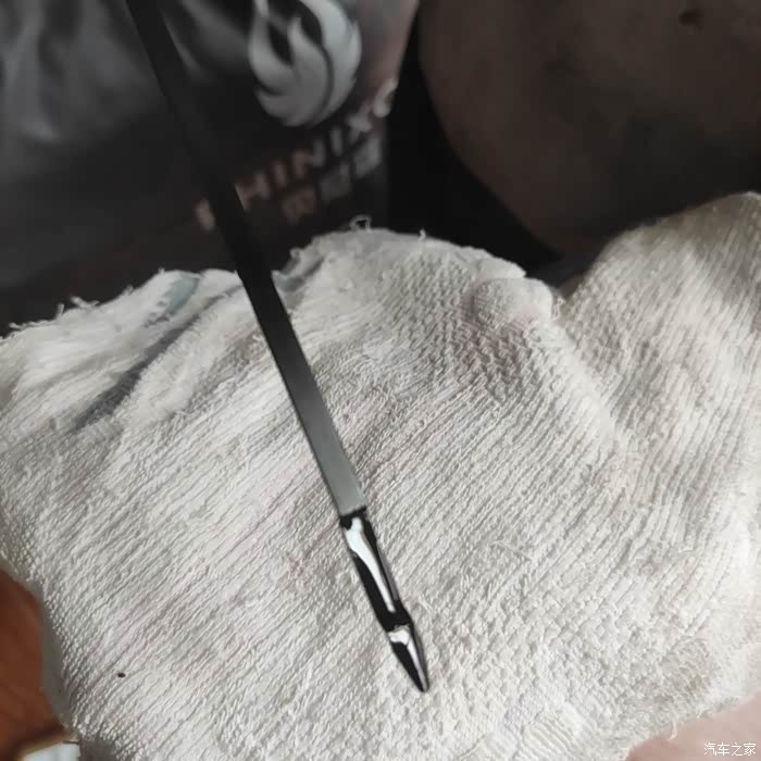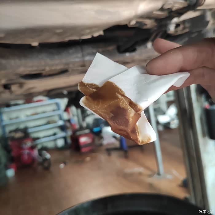 出于好奇弄了一张纸巾,弄了一点机油,看一下颜色有点黑呀,看来日常保养还是不可少。