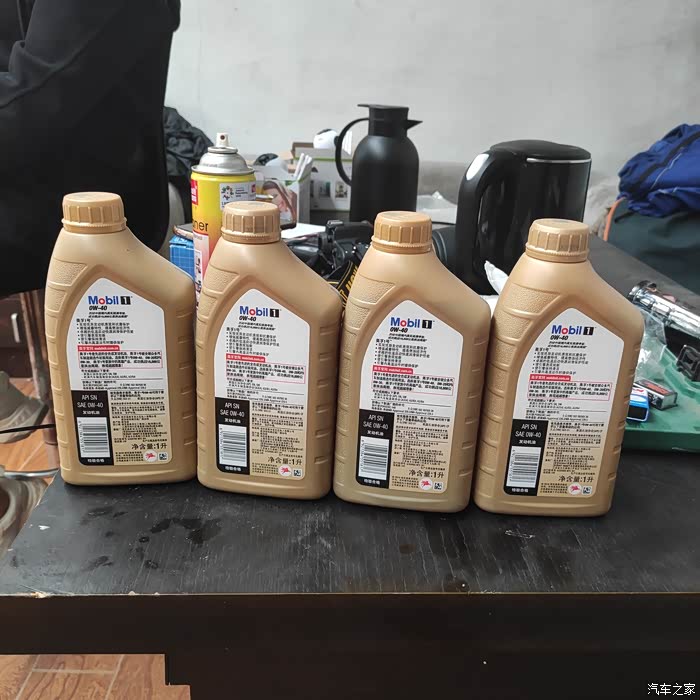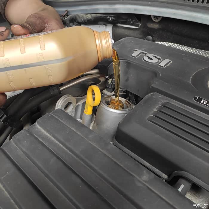 加了三瓶半,感觉差不多了,又用机油标尺测一下,发现还不够,又把剩的全部加进去。