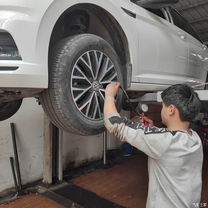 机油换完,师傅再给每个轮胎检查气压,气压不够就冲到标准值。那具体什么是标准值呢?就像我们大众车的话,主驾驶车门打开B柱位置有标准值图,有的则在油箱盖反面。