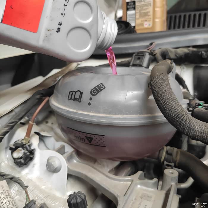 还有这个防冻液也有一个标准,似乎有点少,师傅又帮我加了一点进去。