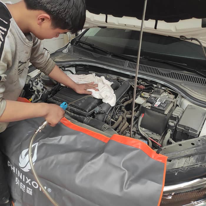 机油换好了,车子降下来,打开机上盖里面铺了一层厚厚的灰,师傅用吹枪吹一下里面的灰尘打理一下线束。