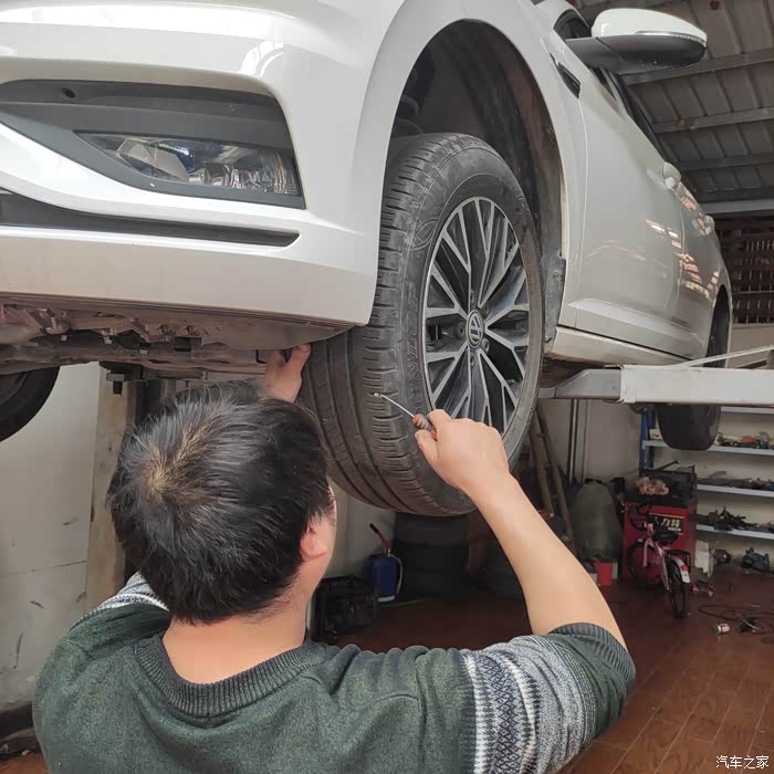 心里窃喜,这是在给我按4S店的标准来做,师傅很用心。用螺丝刀把轮胎里面的小石子挑出来。