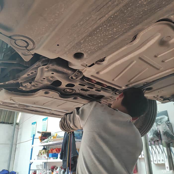 师傅在拆发动机的护板,这也是我第1次看自己的底盘长什么样。