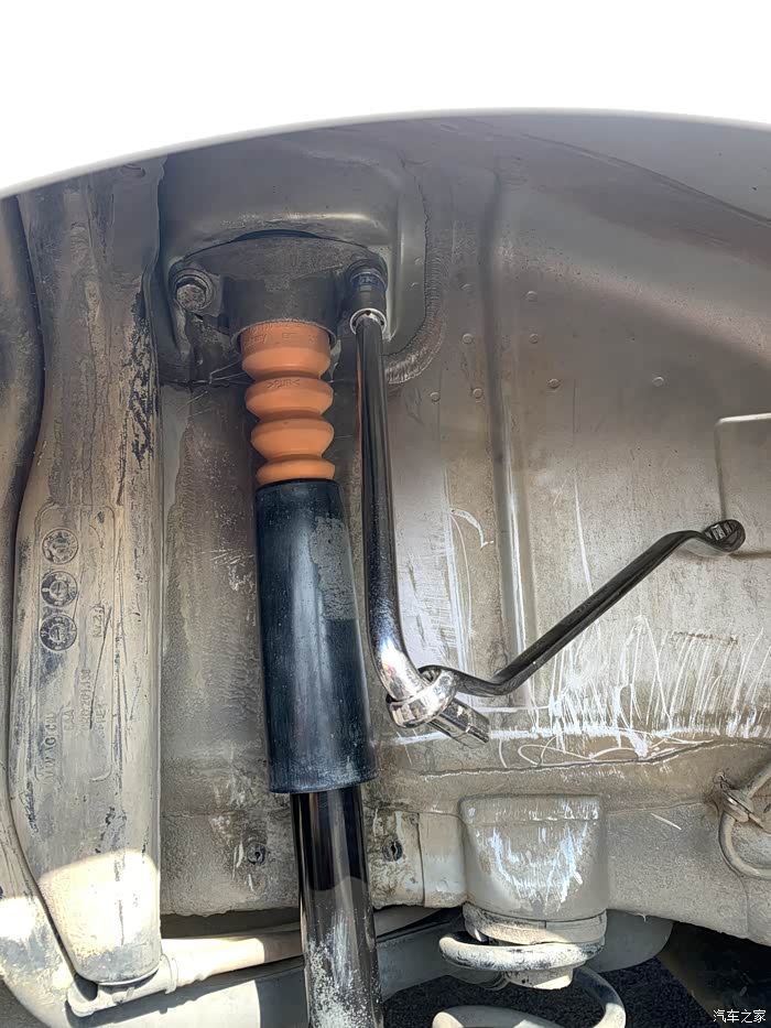 接下来装回车上,先把下端用螺杆固定好,再来锁上端两枚螺丝。锁上端螺丝时可用原车千斤羰把下端慢慢往上顶,使其上端靠近螺丝孔。