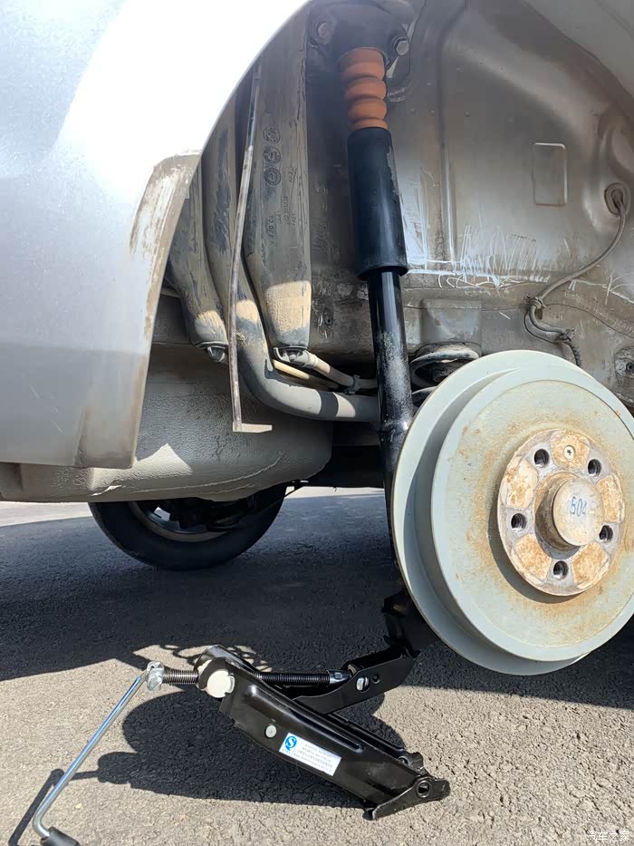 拧松车轮螺丝后,用千斤顶把车顶起来(千斤顶承重一定要够,一个不行可顶两个 保险点,DIY也要安全第一)
