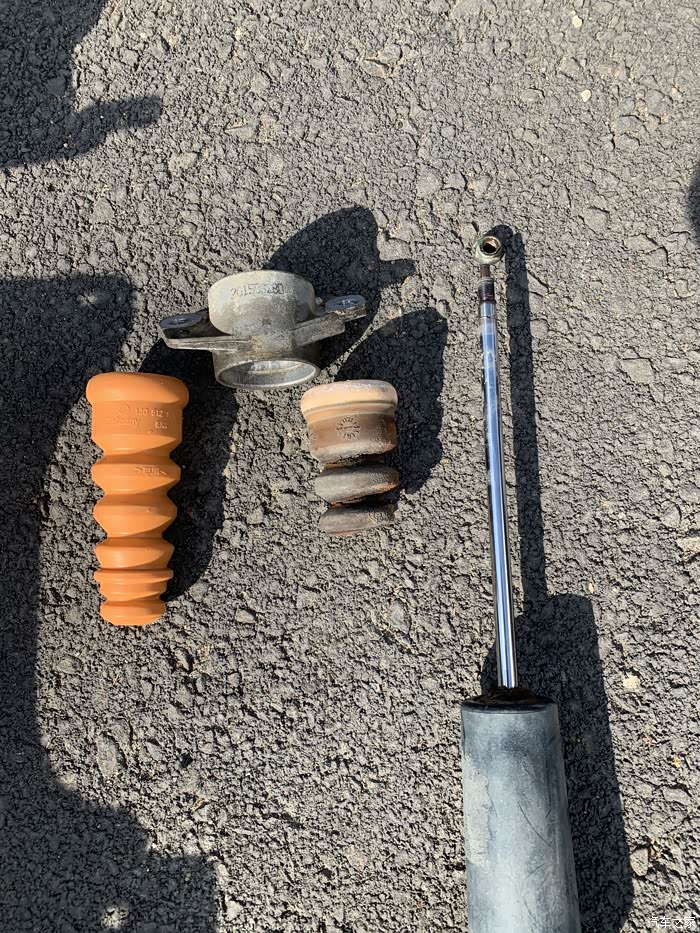 把新的缓震胶下端旋转用力拧进后减防尘套内,上端塞进原来的套头内(可用一字螺丝刀辅助塞入)