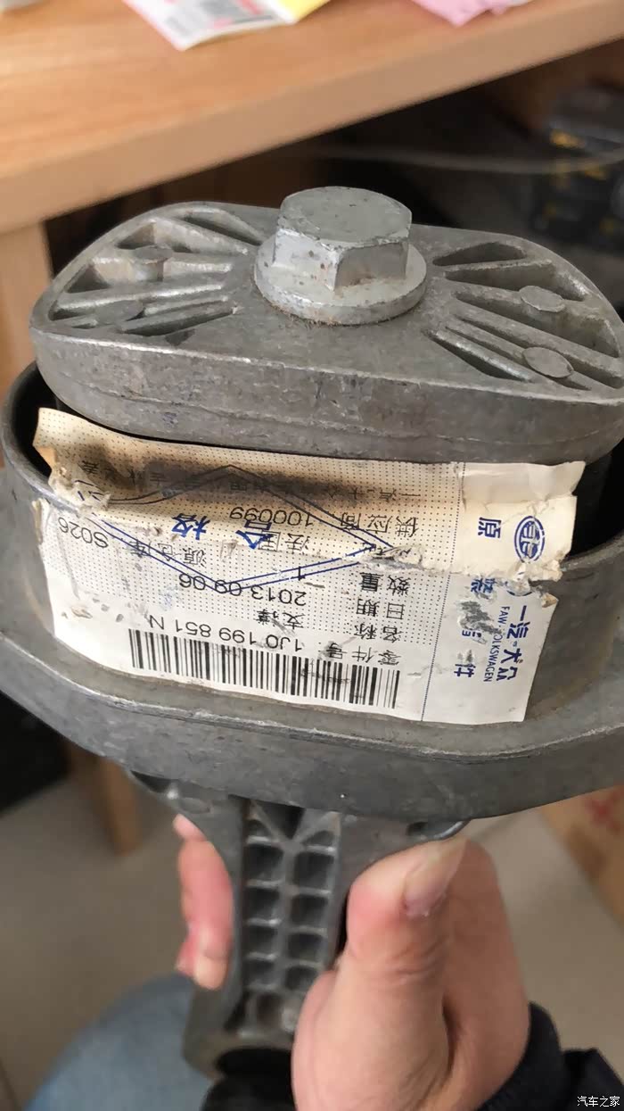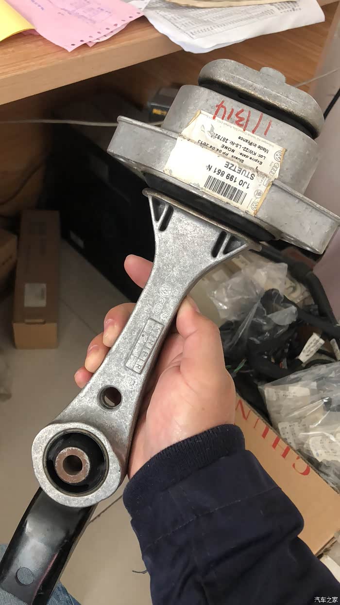这是拆下来的国产件了,因为那家店很暗,我就没拍更换过程,这个不难,就是拆掉空滤盒,拆掉水壶,助力油壶啥的,安装很快,下面的更简单,就四颗螺丝,这里实事求是的说一句,向天保证每一句都是事实,国产件真的不行,拆下来后,按那个橡胶的部位,都是硬邦邦的,根本不像德国件那样有弹性,修车的师傅也看了一会,说,真是不一样。我这个还是国产不错的,也是带着各种编号的,看上去很认真的,但是也是抖,如果不抖,我也不会换了。