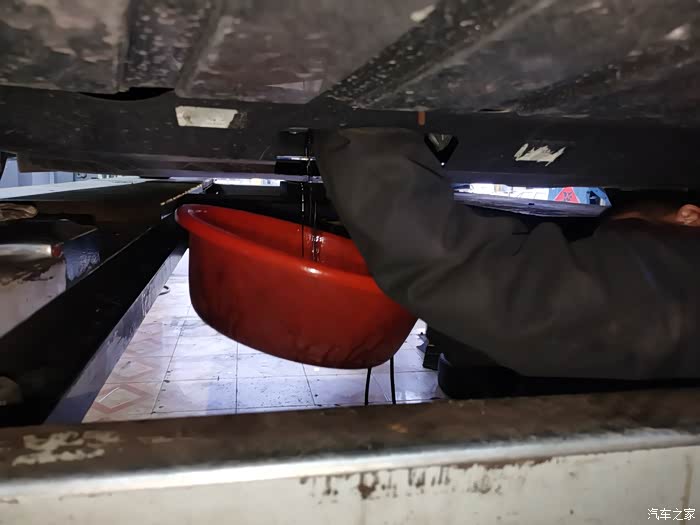 1.与维修厂朋友约好时间,晚上快下班的时候去他店里操作,这样不耽误他的事儿,自己也可以亲自上手实操更有趣,直接打开机油加注口,上举升机准备重力放油 ;